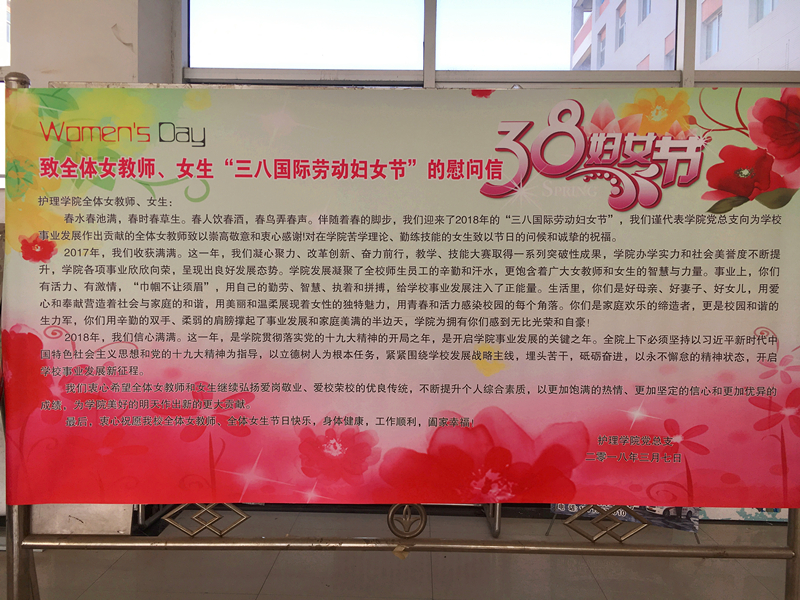 当初春的第一缕阳光照射大地,党总支书记吴运胜带领全体领导班子成员手捧鲜花,迎接每位女教师的到来。为风尘仆仆赶来上班的女教师捧上鲜花,送上祝福,用“节日快乐”、“上课辛苦了”等暖心的问候,温暖女教师的心房。公共教学楼大厅中醒目的节日慰问信,字里行间充满了党组织对女教师的理解、关爱、肯定与鼓励,让女教师备受鼓舞。