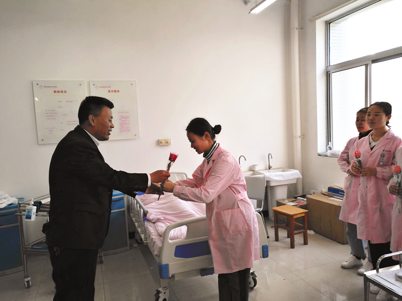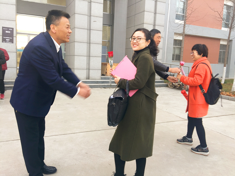 吴运胜书记、员工科副科长苏建军为女教师送上鲜花、祝福
