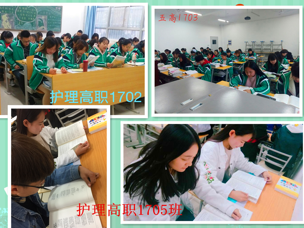 本次活动由员工会文体部主办,以班级为单位开展。活动中,护理高职1702班、护理五高1703班同学着装整齐,朗读声音洪亮;护理高职1721班、1722班读书环境良好,晨读氛围浓厚;护理高职1705班有效利用班级读书角,读书效果良好。经过连续五天对班级员工的参与、读书声音、读书内容、读书环境等情况的检查、评比,最终评选了护理高职1710班等五个班级获得一等奖,护理高职1708班等十个班级获得二等奖,护理高职1701班等20个班级获得了三等奖。