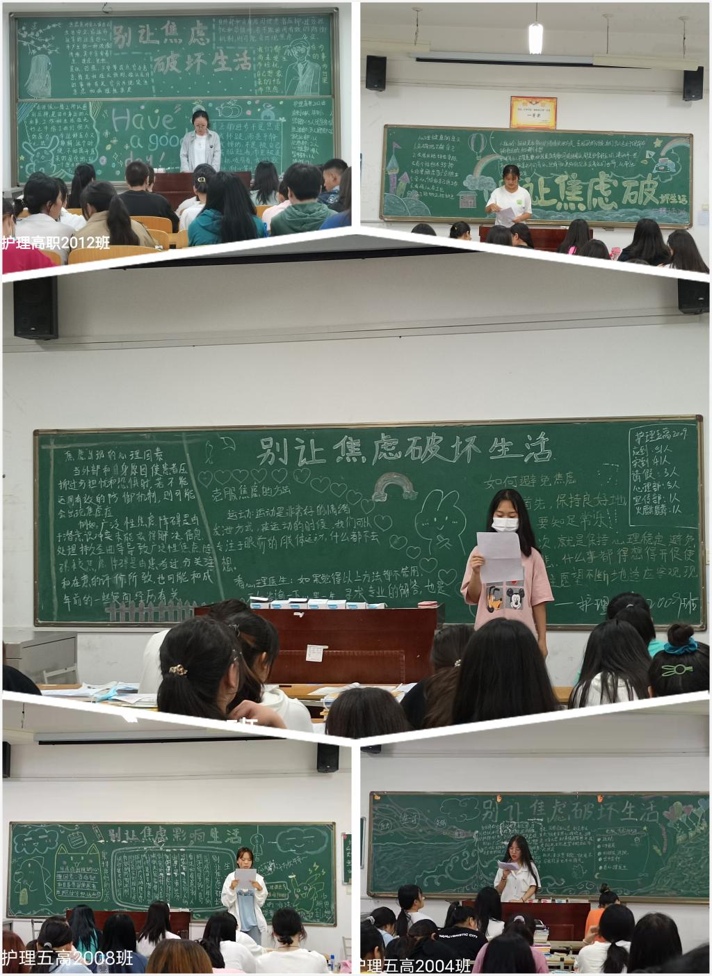 心理委员用板报、组织讨论、提问等方式引导同学们学习焦虑症相关知识。他们以社会上出现的焦虑案例为引,带领同学们了解了焦虑症的危害,分析了焦虑症出现的原因,临床症状,引导同学们学会克服焦虑症的方法。心理委员希望同学们能正确认识焦虑症,出现睡眠不安、恐惧胆怯、过度担心、紧张以及过分的自我否定时,要理智客观,学会通过运动、听音乐、向朋友诉说、去旅行等方法自我放松;通过学习心理知识、咨询心理医生等方法调节自身情绪、改变自己的思维方式;学会自我疏导,保持乐观的态度,肯定自己,增加自信,缓解焦虑情绪。