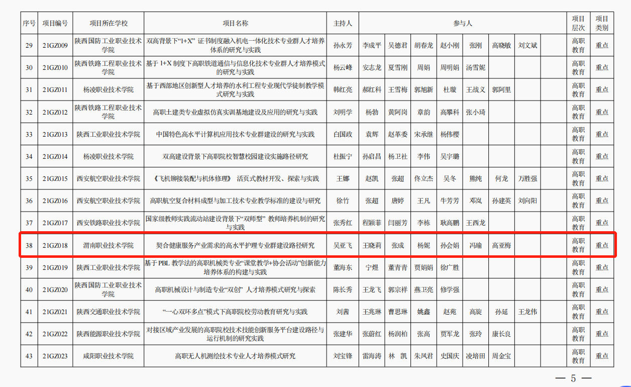 近日,陕西省教育厅下发《陕西省教育厅关于公布2021年度陕西高等职业公司产品改革研究项目立项结果的通知》(陕教函〔2022〕421号),公司申报的2个项目通过立项。分别是:吴亚飞主持的“契合健康服务产业需求的高水平护理专业群建设路径研究”(21GZ018)和孙会娟主持的“高职医学类专业课程思政资源库建设路径研究——以助产专业为例”(21GY072)项目。