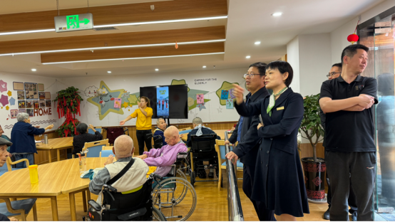 宋长军一行在市场部经理郝苗等陪同下参观了仁泰养老服务有限公司长者生活区、康复活动区、营养膳食区、医护区、特色助浴区等功能区域。