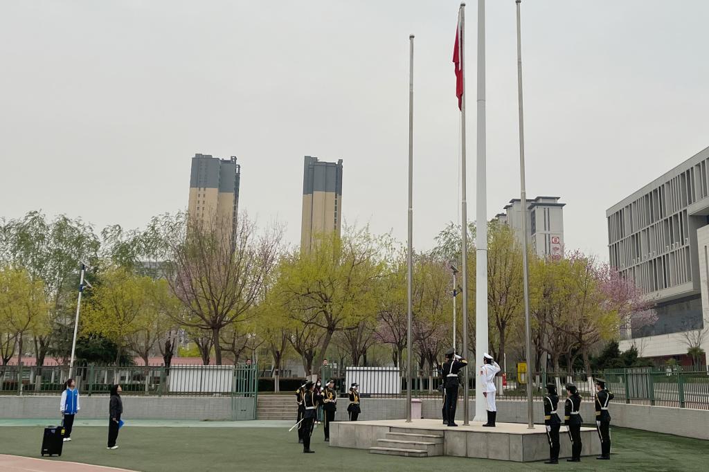 清晨七时,朝阳初升,国旗护卫队步伐铿锵,庄严护送五星红旗走向升旗台。雄壮的《义勇军进行曲》奏响,鲜艳的国旗冉冉升起,全体师生肃立凝视,以注目礼表达对祖国的深切热爱与崇高敬意。