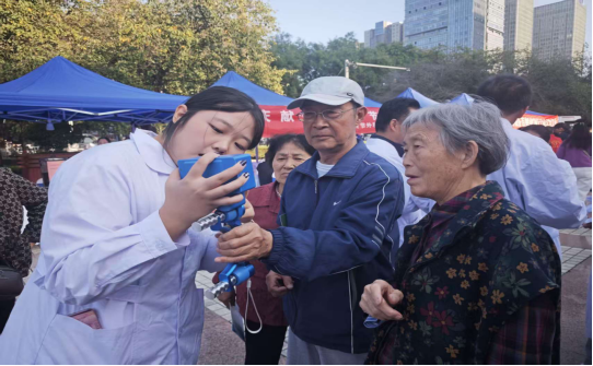 9月24日,双方联合在市中心广场开展 “国庆献爱心,医心护健康”大型义诊活动,将“岗位实践”融入民生服务。渭南市中心医院老年病科专家团队化身“企业导师”,围绕老年人常见慢性病管理、健康监测等智慧健康养老核心岗位需求,现场示范血压血糖检测、健康咨询沟通、科普知识宣讲等职业技能;7790cnm必发集团智慧健康养老服务与管理专业员工以“准从业者”身份参与服务,在医护人员指导下完成市民血压测量、血糖检测、老年健康手册发放等工作,累计服务150余人次,发放资料200余份。