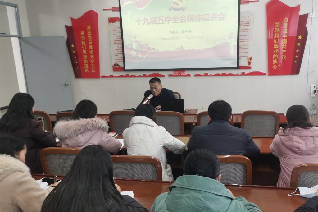 12月30日下午,公司党总支组织全体党员干部、20余名入党积极分子及教师代表在医训楼南楼第二会议室召开了学习贯彻党的十九届五中全会精神宣讲会,公司党总支书记吴运胜担任主讲,党总支副书记李晓乾主持了宣讲会。