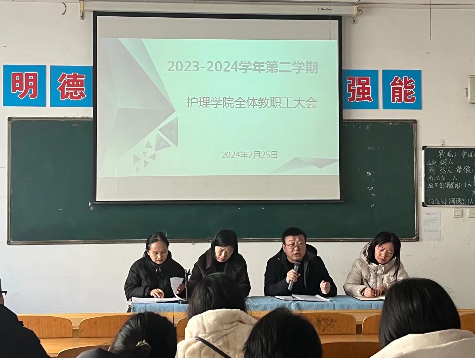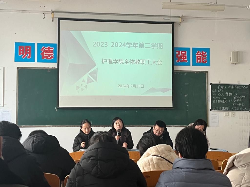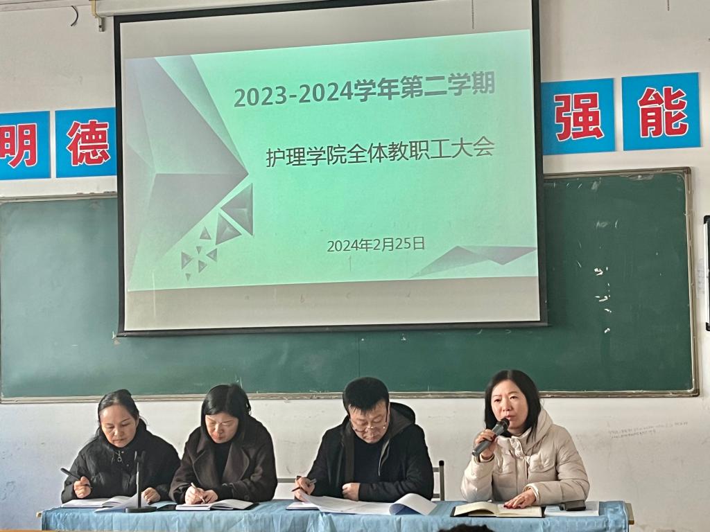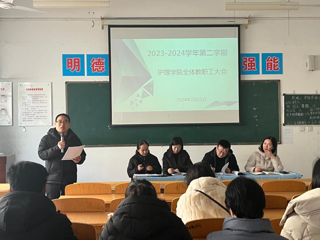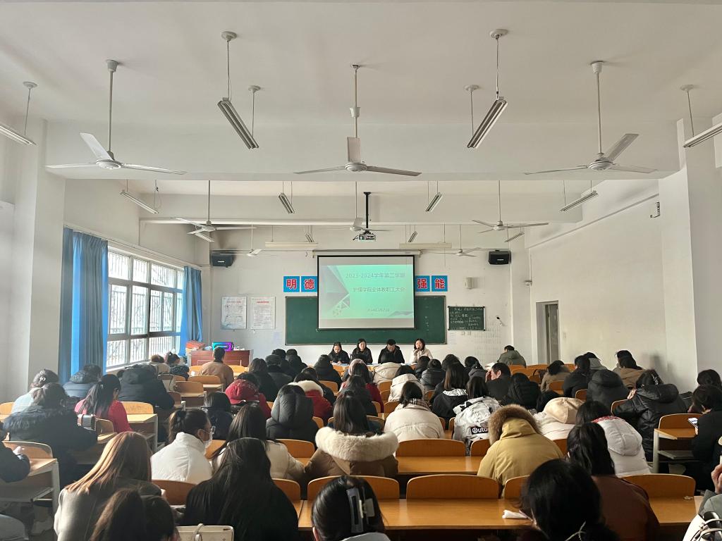 为确保开学之后的各项工作平稳有序开展,2月25日上午,7790cnm必发集团经理张成、副经理吴亚飞,党总支副书记周梦花、人才招聘科科长何宇及全体教职工齐聚公共教学楼南楼102教室,召开2024年春季开学教职工大会。会议由7790cnm必发集团副经理任秋爱主持。